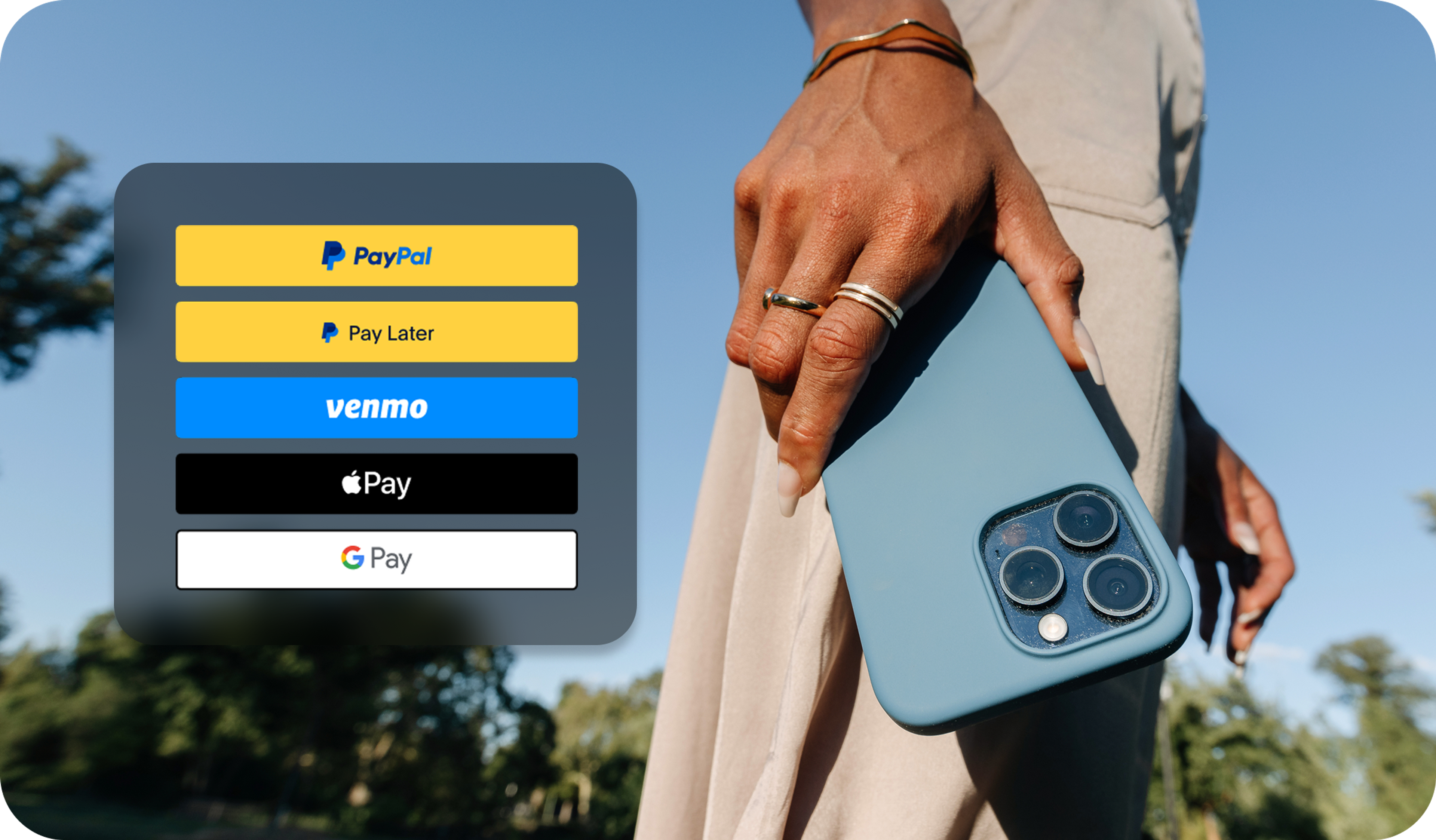 Give customers the wallets they expect. Apple Pay®, Google Pay™, and credit cards in one clean flow. Fast checkout. Fewer drop-offs.